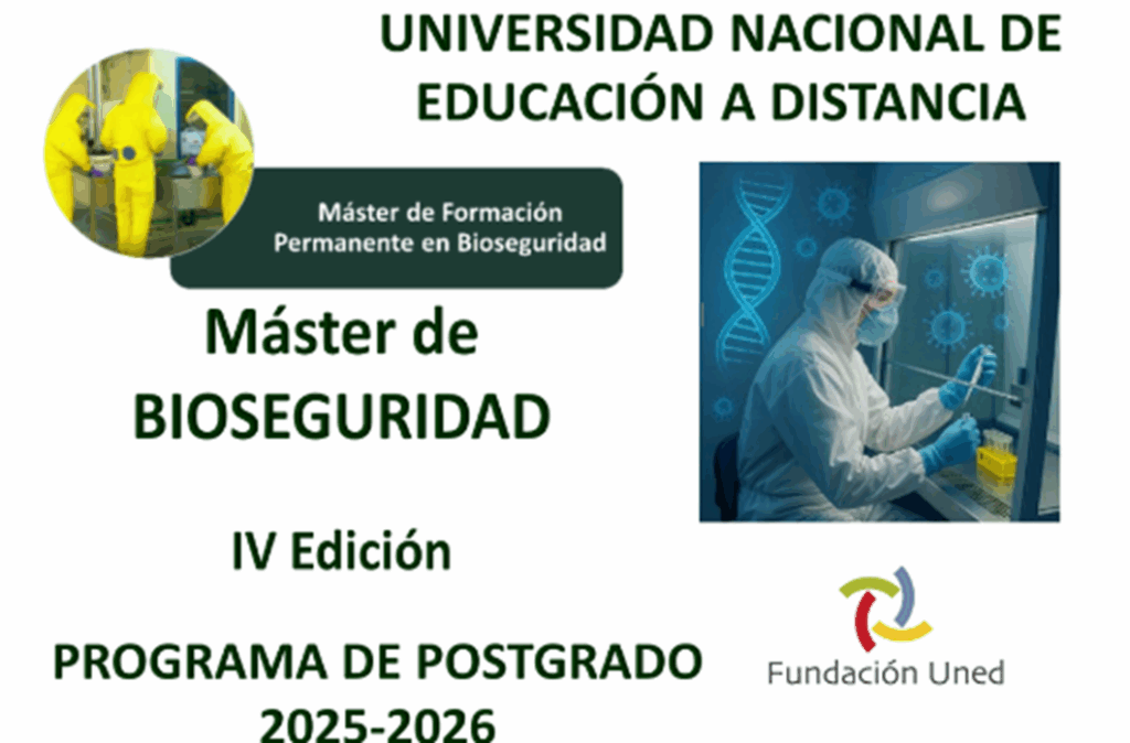 Este máster en Bioseguridad tiene como finalidad una formación en bioseguridad específica para alcanzar las competencias del profesional de bioseguridad según la norma UNE-CWA 16335: 2014. Se imparte según la metodología a distancia de la UNED. Su realización da derecho a la obtención de un Título Propio.